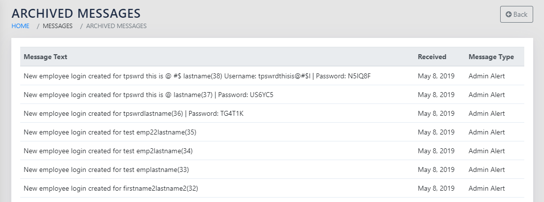 On clicking the message icon, the Admin is taken to a page where information on the employee ID, Name, The username and password is available for each user. Once the administrator informs the users, they can use the CheckMark against the user entry to archive the message (Figure 24: New User Login Credentials).