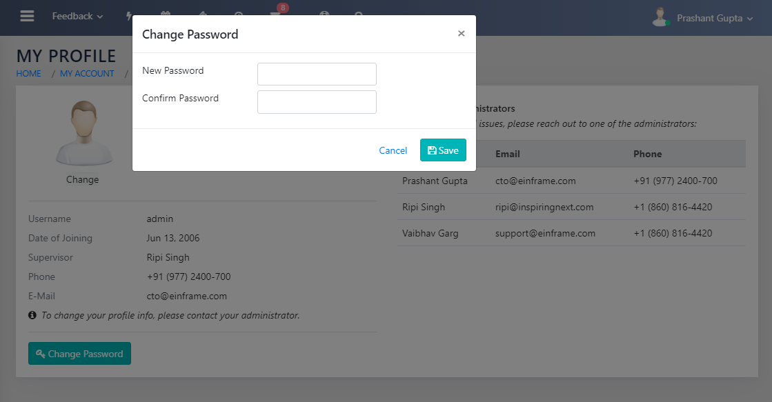 Any Logged in user can change their passwords and upload their photograph click on login user in their top Navigation Bar and after than click edit profile. This will take them to the screen shown in Figure 26: Change and Fill Login Details.