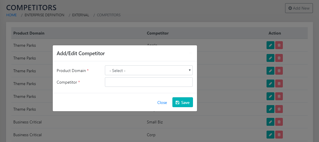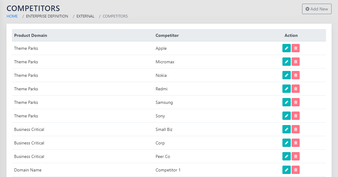 On navigating to the page shown in Figure 142: List of Competitors by Product Domains, the user is presented with the list of all competitors by product domains. The user can click the icon or the Add New button to take them to the page shown in Figure 143: Add Competitor by Domain