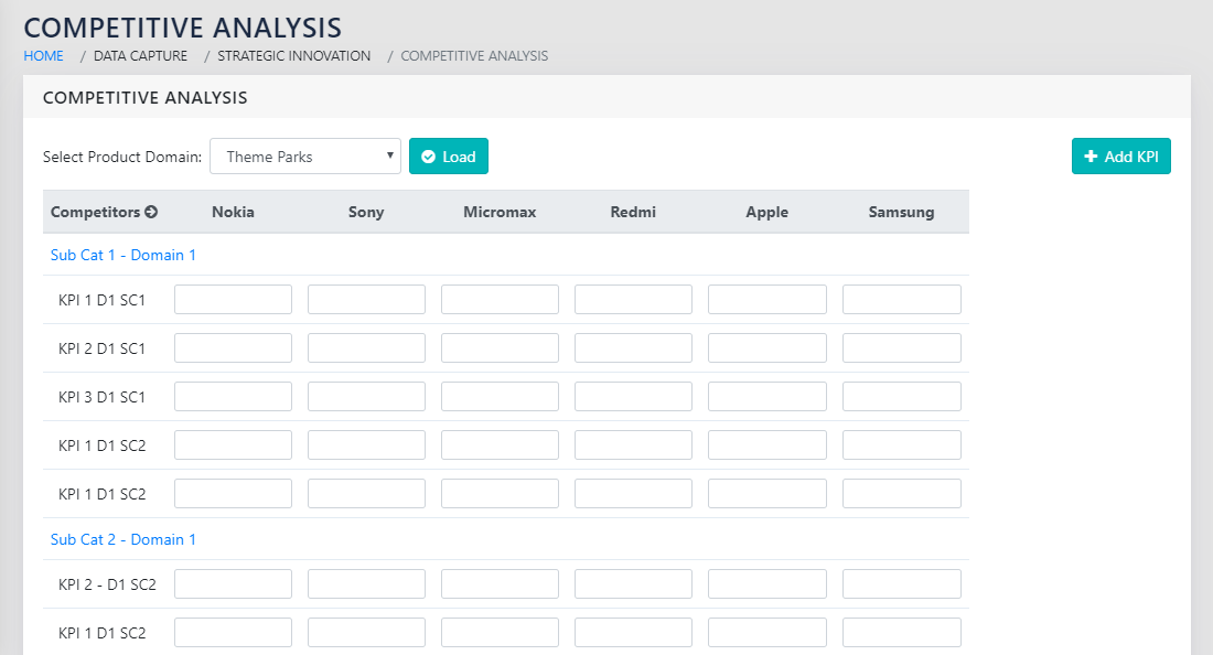 All the product KPIs that have been selected for competitive analysis are shown here. The column names are all the competitors for a given product domain.