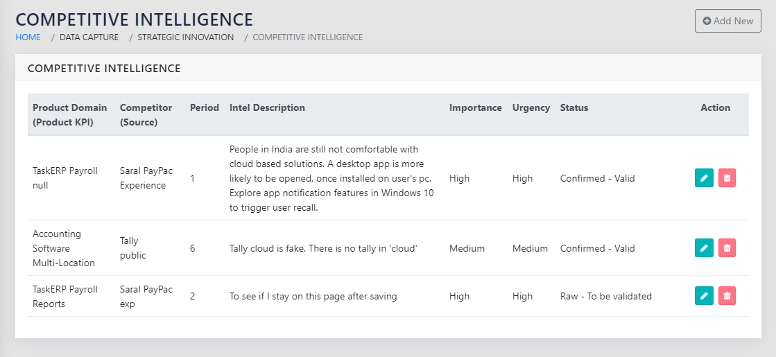 On navigating to the page shown in Figure 233: Competitive Intelligence- Landing Page, a list of all intel items is seen. When the user clicks on Add New button, they can add a new piece of intel.