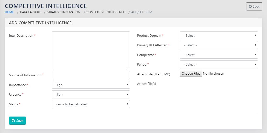 On clicking the Add New button, the user is taken to the page shown in Figure 234: Add a Piece of new Competitive Intelligence. Using this page the user can enter the description , the source of intel, its importance, urgency and other information; in addition to the product domain that it applies to and the competitor that it pertains to. The user can also capture the relevant period of applicability which is a dropdown populated using the information in the product domain framework.