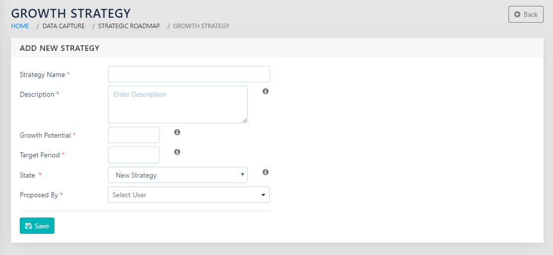 On clicking the Add New button, the user sees the page as shown in Figure 105: Identify a new Growth Strategy.