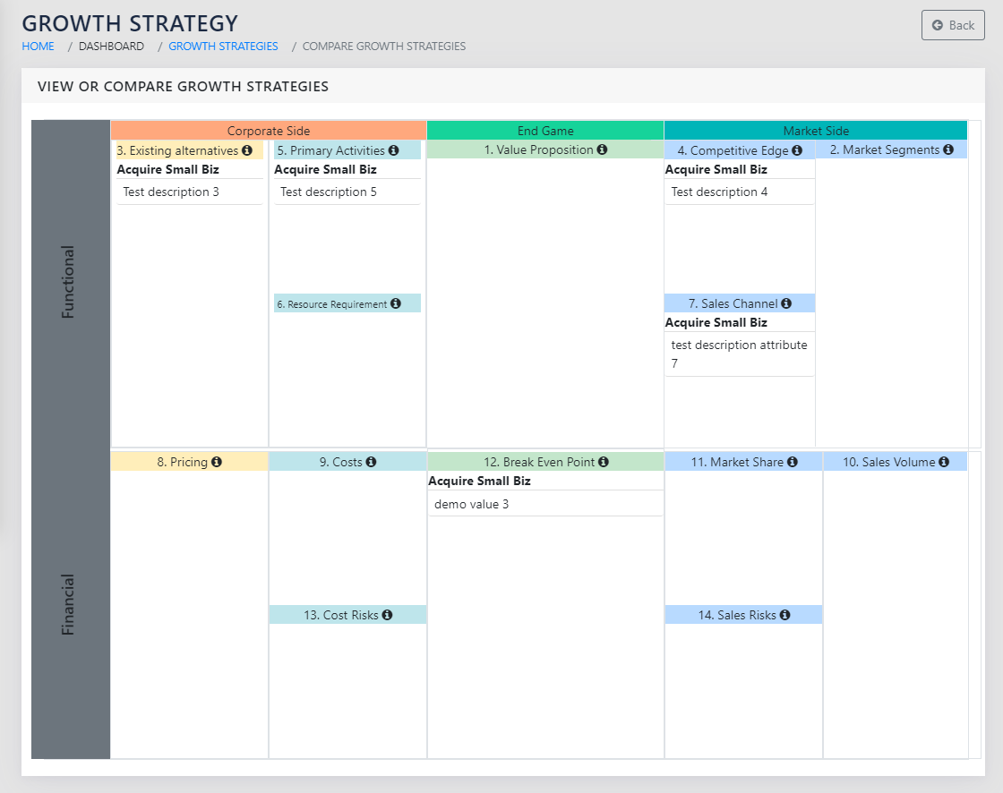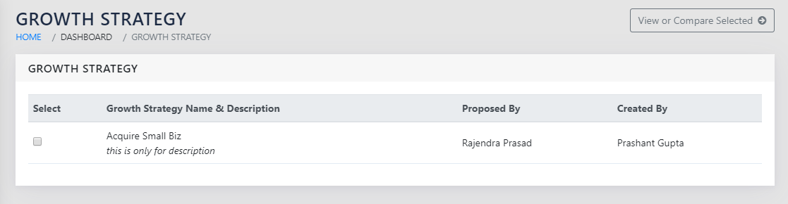 The user can select up to 3 strategies using the checkboxes in the name and click on View or Compare Selected . This opens the page shown in Figure 108: View or compare Growth Strategies. This contains all the values against all attributes captured against the selected strategies. This also shows the growth potential and the time period in the form of NxMy against each strategy.
