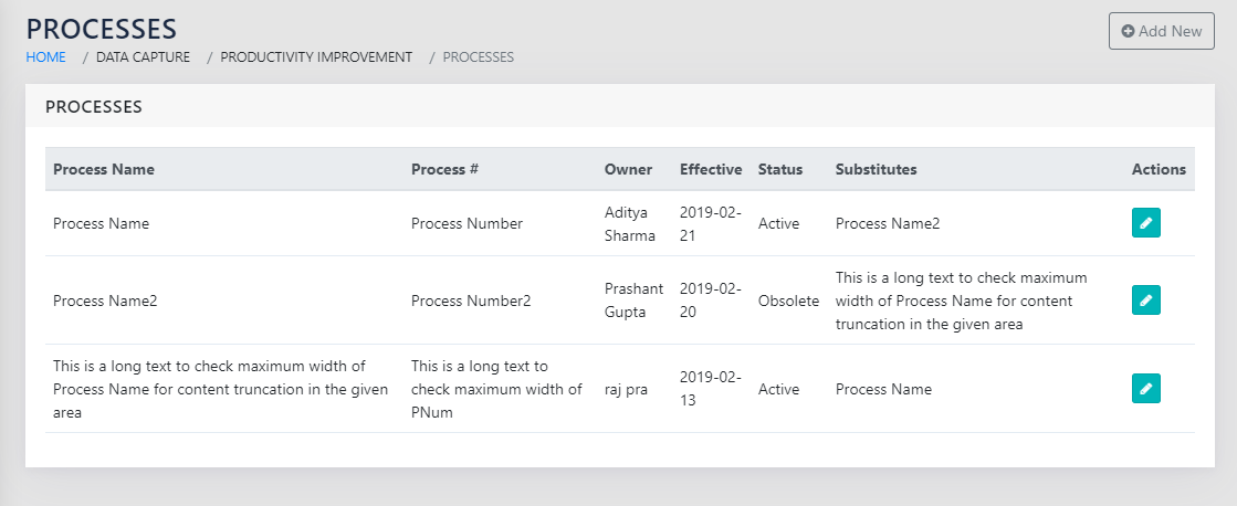 Figure 54: List of Processes shows the list of all processes that exist in the system. On clicking the icon or on adding a new process, a page shown in Figure 55: Add a New Process is presented to the user.