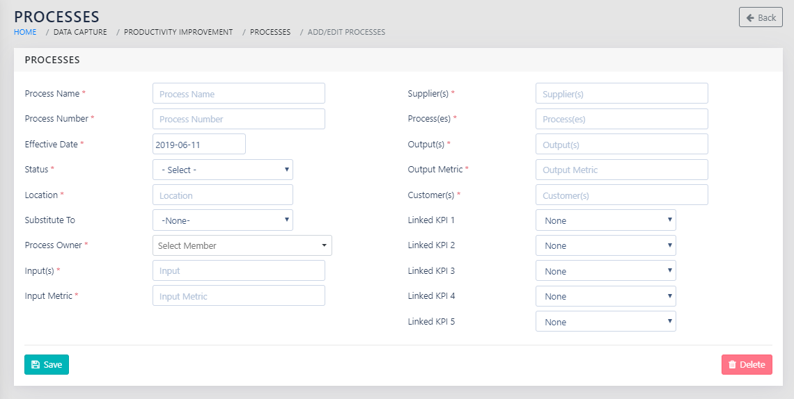 - Process Owner- Employee Name – The employee who owns the process. This may be linked to the employees IDP.