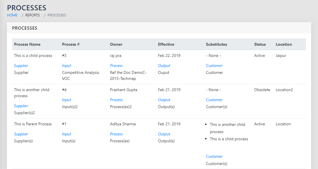 The processes report as shown in Figure 56: Processes Report shows the process details with its SIPOC flow.